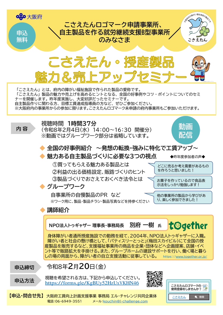 2月4日(水)に開催しましたこさえたん・授産製品魅力&売上アップセミナーのアーカイブ配信のお知らせです。