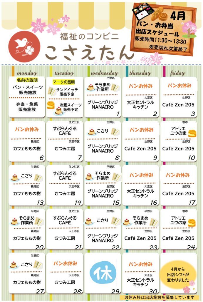 福祉のコンビニこさえたん3月・4月の出店スケジュール
